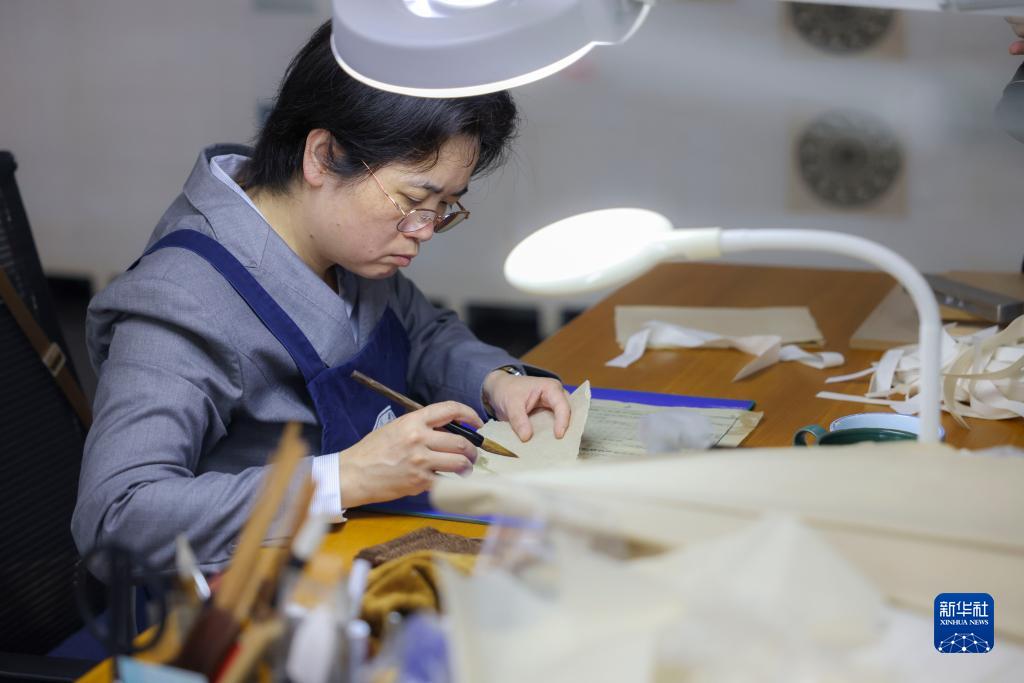 4月14日,在廣西壯族自治區圖書(shū)館古籍保護中心的工作室內,黃玉杏在修補古籍。