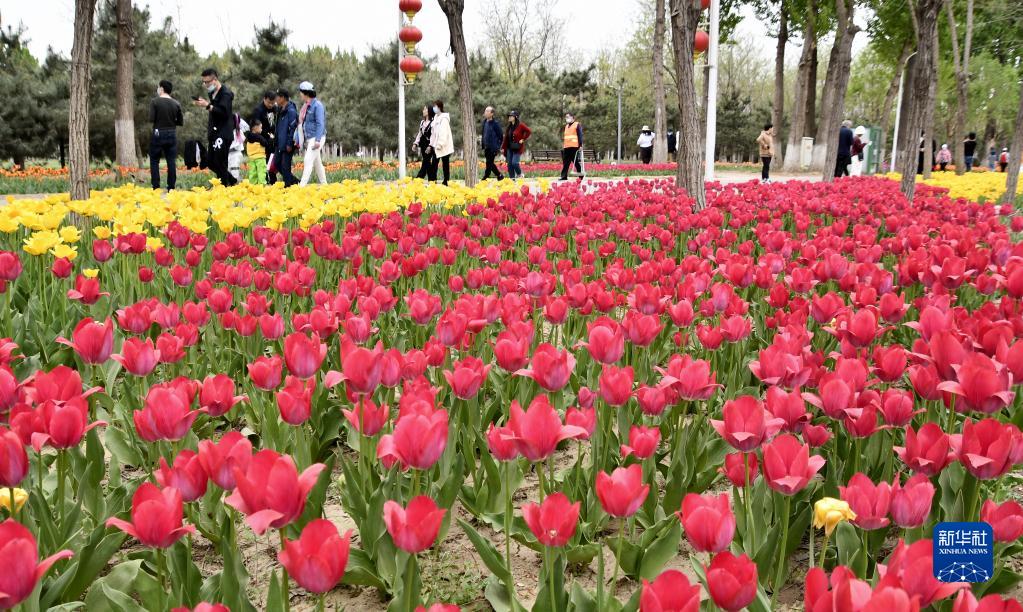 當日,北京永定河綠色港灣郁金香文化節在大興區北臧村鎮開(kāi)幕,100余萬(wàn)株各式花卉競相開(kāi)放,游客徘徊其間宛如游弋在七彩花海。
