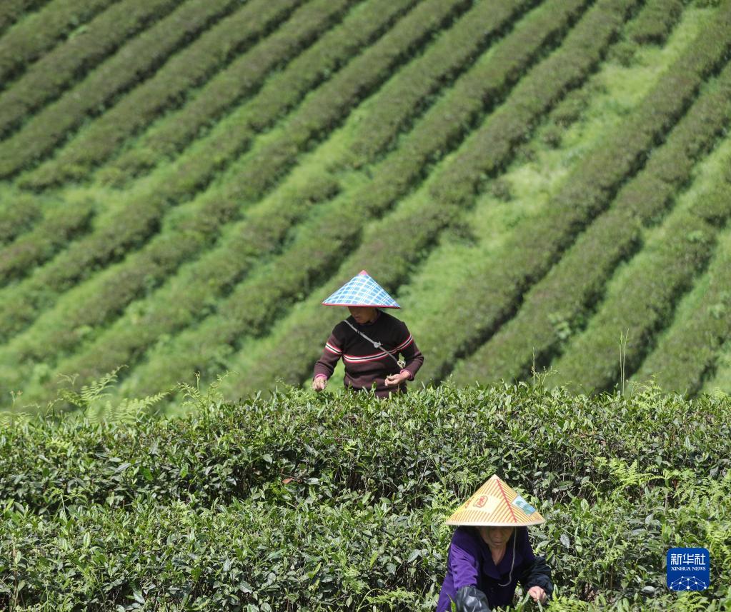 4月15日,貴州省開(kāi)陽(yáng)縣南龍鄉東官村一生態(tài)茶園,茶農在采摘春茶。