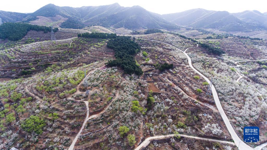 4月15日,天津市薊州區羅莊子鎮楊家峪村的紅香酥梨種植基地梨花盛開(kāi)(無(wú)人機照片)。
