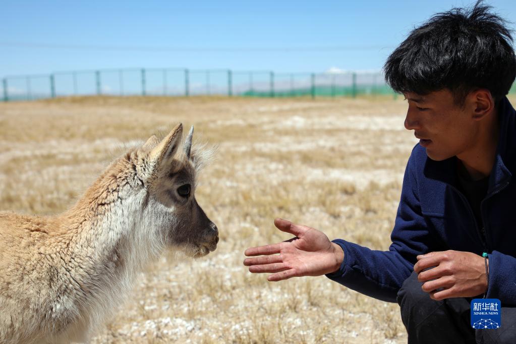 4月15日,索南達杰保護站巡山隊員才文多杰與被救助藏羚羊幼崽互動(dòng)。