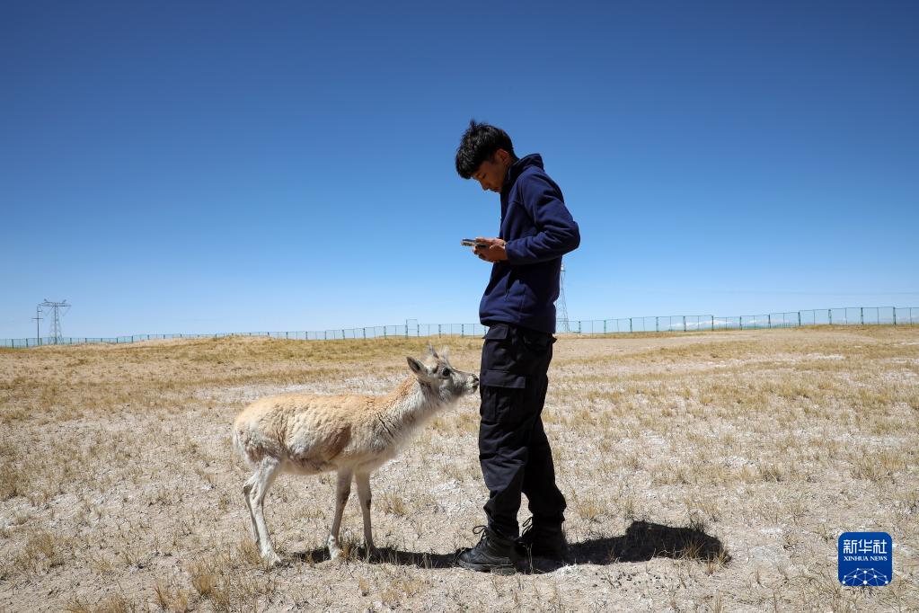 4月15日,索南達杰保護站巡山隊員才文多杰在拍攝被救助藏羚羊幼崽的生長(cháng)情況影像。