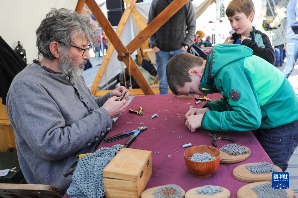 4月15日,在比利時(shí)那慕爾市傳統民俗日活動(dòng)上,兒童在一名手工藝人的攤位了解鏈甲制作技巧。