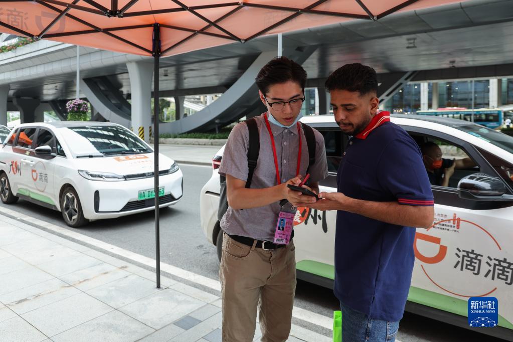 4月15日,一位外國客商在服務(wù)人員幫助下學(xué)習使用網(wǎng)約車(chē)打車(chē)軟件。本屆廣交會(huì )專(zhuān)門(mén)在場(chǎng)館區域設置了網(wǎng)約車(chē)乘車(chē)點(diǎn),方便客商便捷通行。