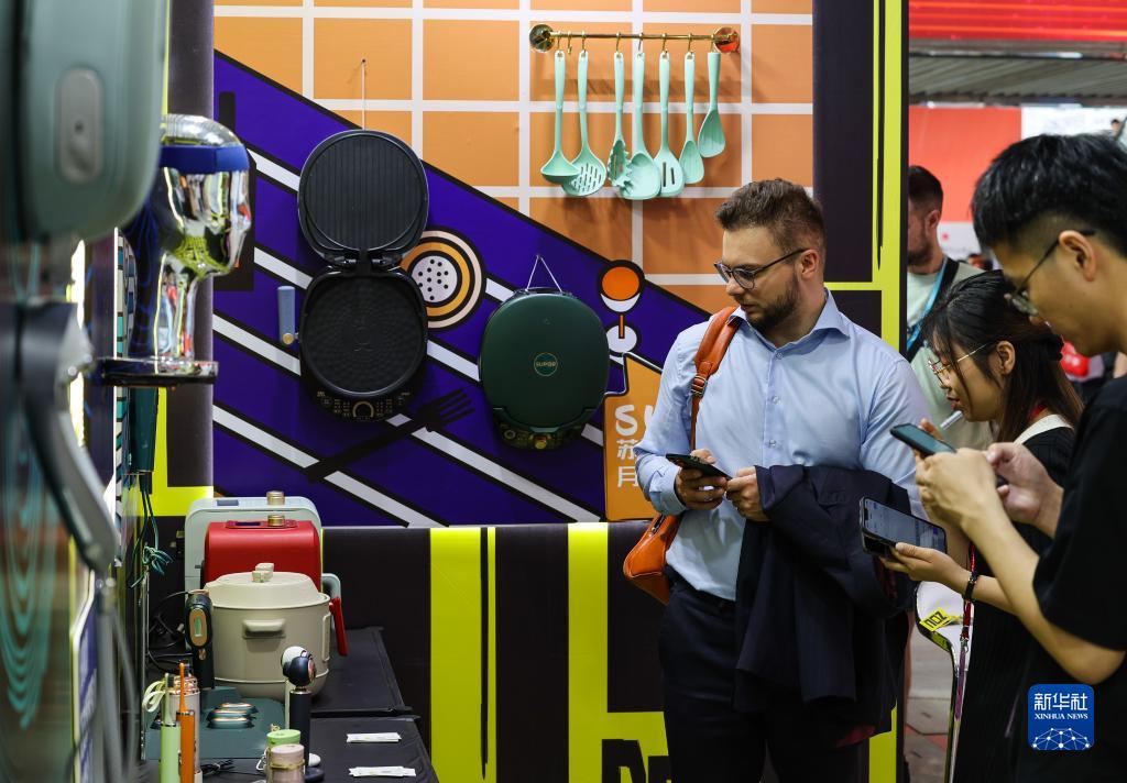 4月15日,采購商在第133屆廣交會(huì )上了解一家中國工業(yè)設計企業(yè)的廚房電器展品。