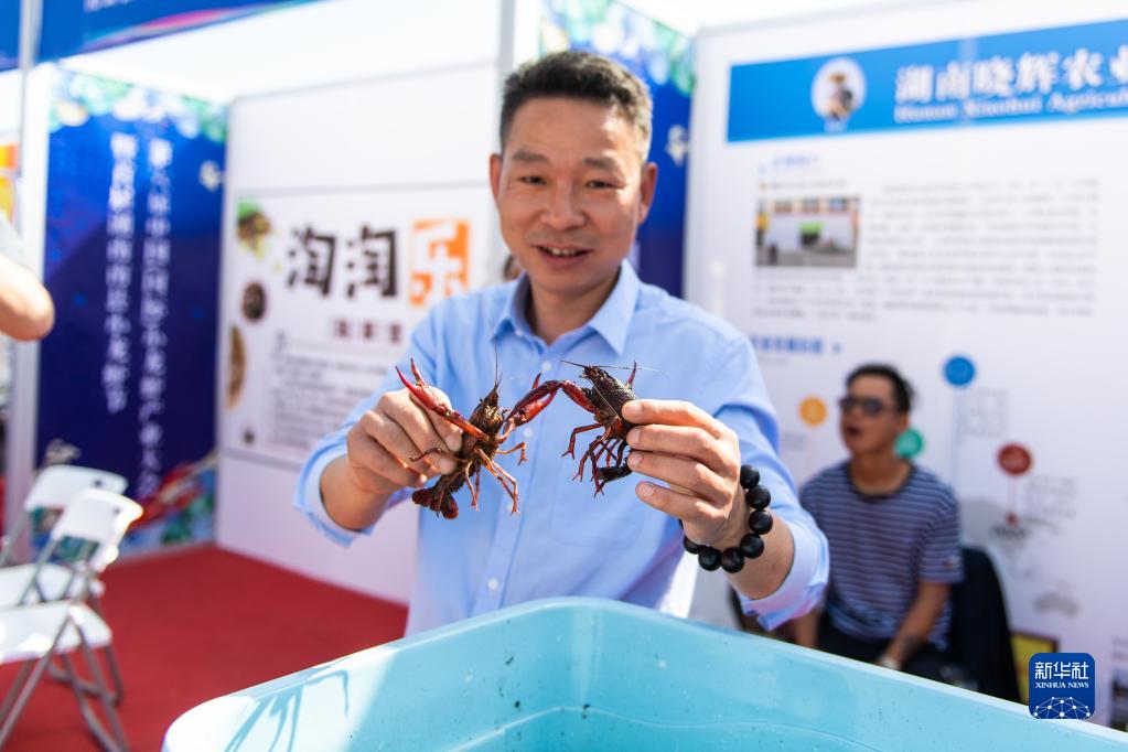 4月16日,在益陽(yáng)市南縣南洲廣場(chǎng),參展商在展示小龍蝦。