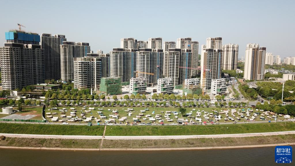 4月16日,市民在長(cháng)沙市開(kāi)福區湘江畔露營(yíng)休閑(無(wú)人機照片)。