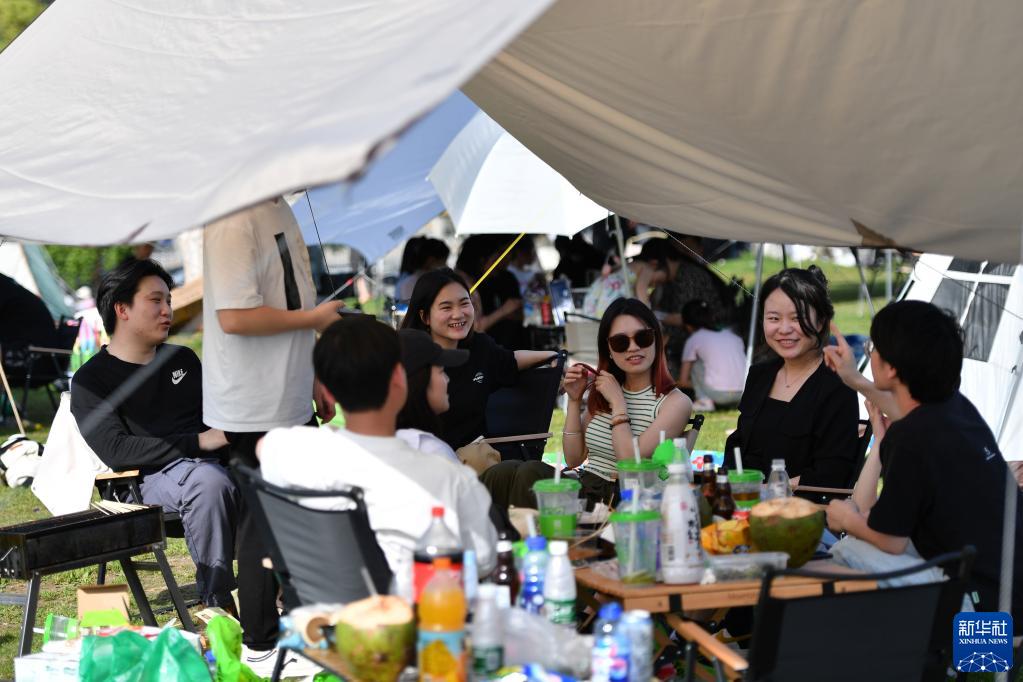 4月16日,市民在長(cháng)沙市開(kāi)福區湘江畔露營(yíng)休閑。