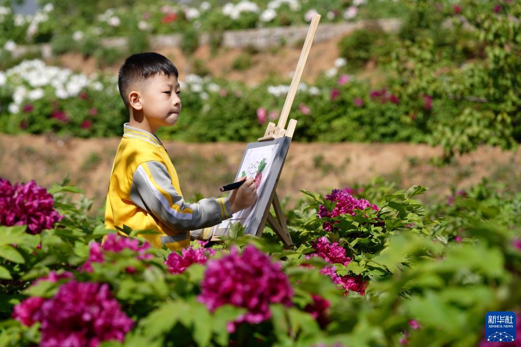 4月16日,小朋友在白臺峪村牡丹農業(yè)產(chǎn)業(yè)園內寫(xiě)生。