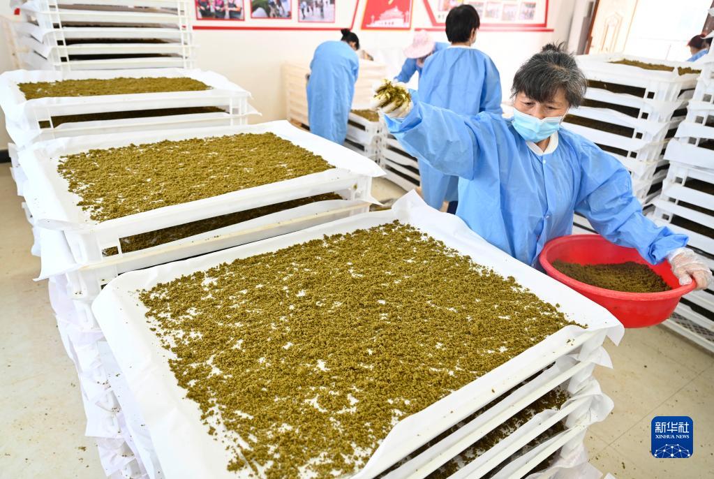 4月16日,在柳城縣沖脈鎮一家桑蠶專(zhuān)業(yè)合作社,農民把使用桑葉等材料制成的飼料攤鋪在蠶框上。