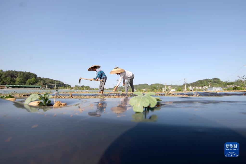 4月16日,在貴州省銅仁市玉屏侗族自治縣新店鎮沙水坪村,村民在西瓜地里蓋膜。