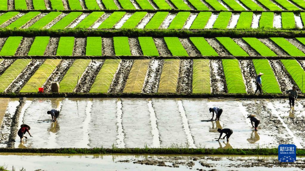 4月16日,湖南省常寧市洋泉鎮水龍村村民在平整秧田(無(wú)人機照片)。