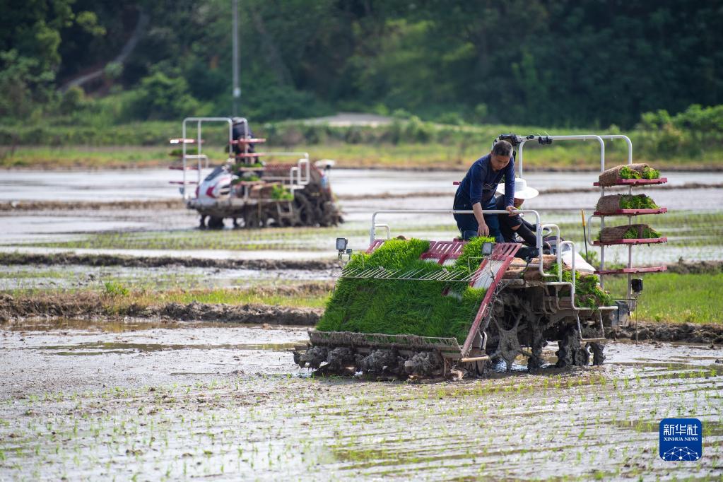 4月17日,在長(cháng)沙市望城區烏山街道黃花嶺村,村民駕駛插秧機進(jìn)行水稻插秧作業(yè)。