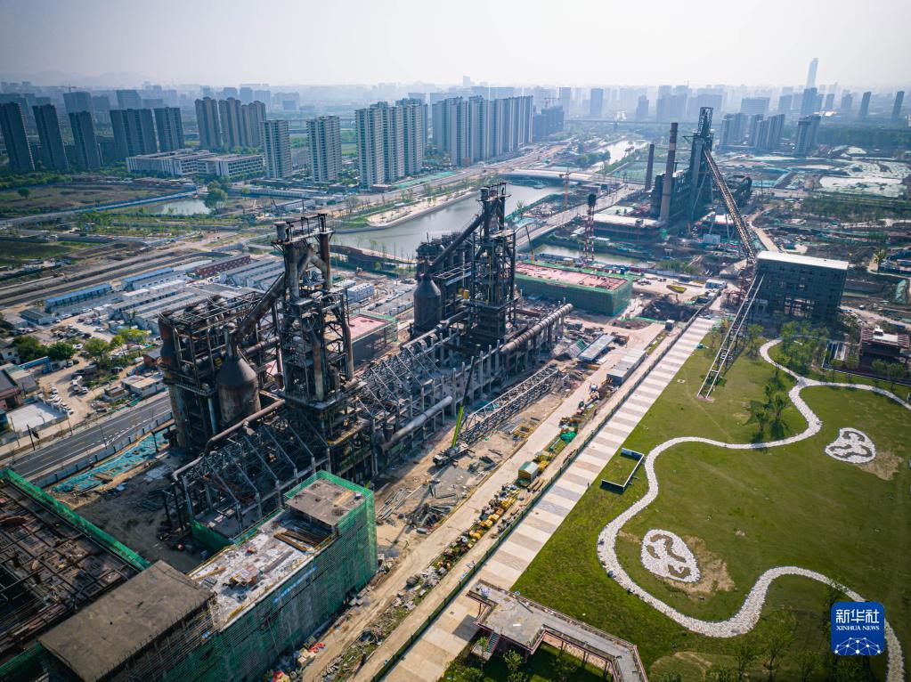 杭鋼工業(yè)舊址公園內改造中的煉鐵高爐等工業(yè)遺存(無(wú)人機照片,4月17日攝)。