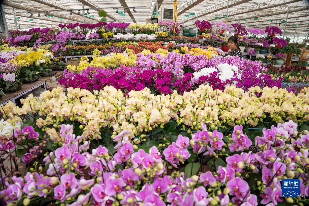 4月17日,在河北省廊坊市永清縣恒美國際花都,一名商戶(hù)打理自己家的蝴蝶蘭。