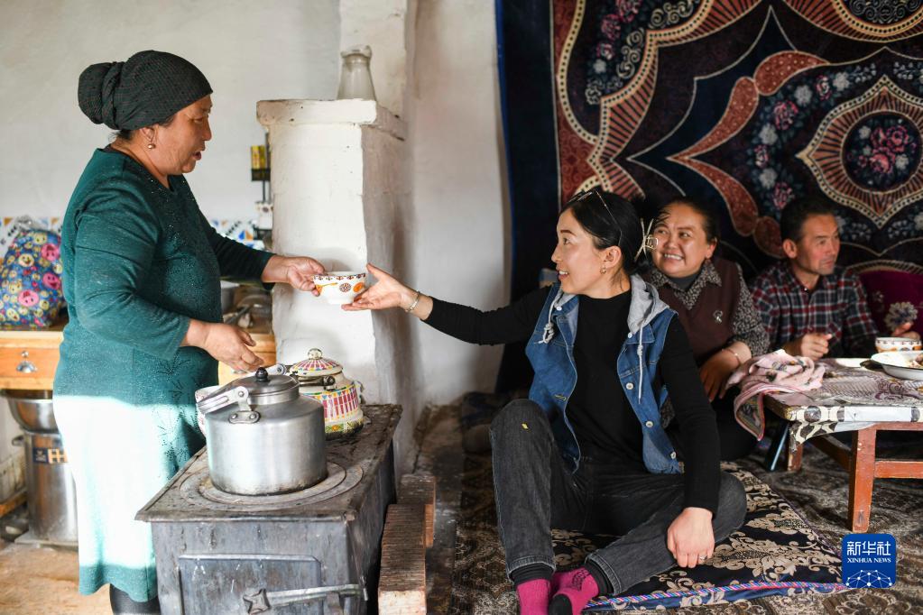 家中有親戚來(lái)訪(fǎng),巴哈提(左一)在爐灶旁加熱奶茶,大女兒加孜拉(左二)幫忙遞給客人(4月12日攝)。
