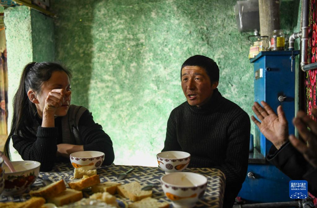 昆樹(shù)阿克當天要離家去烏魯木齊上大學(xué),哥哥賽孜木在餐桌上即興唱起自編的祝福歌曲。昆樹(shù)阿克在一旁認真聆聽(tīng),在動(dòng)情時(shí)擦拭眼淚(2月15日攝)。