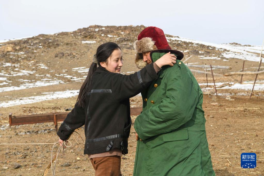 哈布得拉什么準備騎馬外出尋找羊群,小女兒昆樹(shù)阿克從屋內拿來(lái)厚大衣,一手牽著(zhù)馬,一手幫父親整理衣領(lǐng)(2月14日攝)。