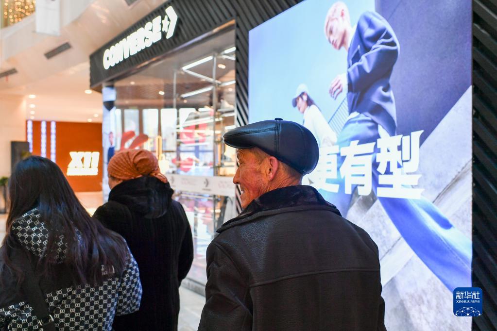哈布得拉什么和妻子、小女兒一起在烏魯木齊市天山區的一家商業(yè)綜合體逛街(2月17日攝)。這是哈布得拉什么人生中第一次來(lái)到烏魯木齊。