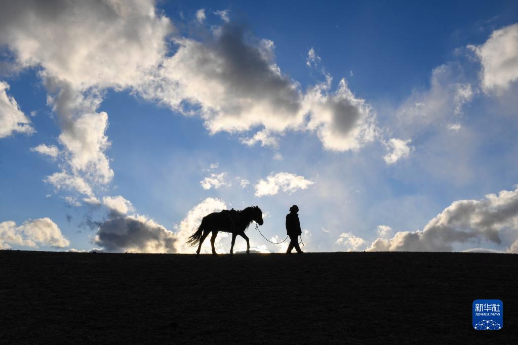 牧歸時(shí)分,哈布得拉什么牽著(zhù)馬走在春草場(chǎng)的一處高坡上,觀(guān)看羊群吃草的情況(4月12日攝)。他習慣提前找到羊群,然后等待至太陽(yáng)下山,才將羊群緩緩趕回家。