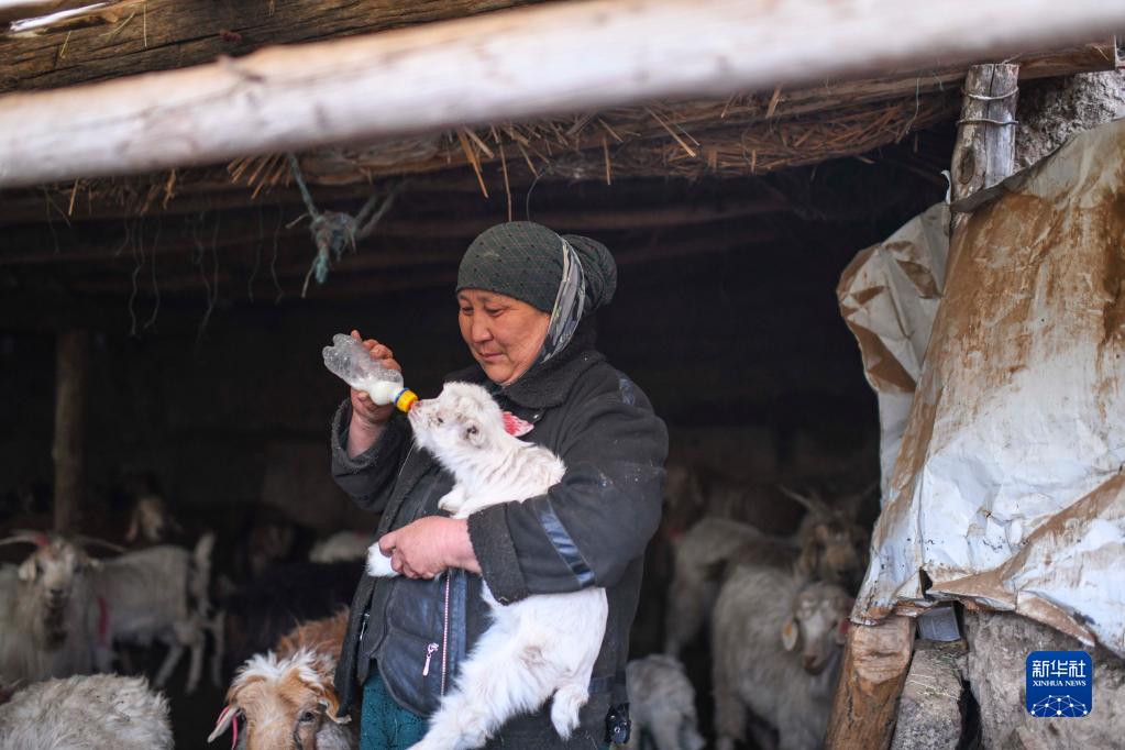 巴哈提給一只出生不久的小羊羔喂食牛奶(4月12日攝)。