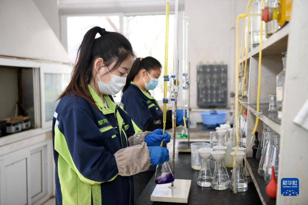 4月18日,在河北省承德市隆化縣一化肥生產(chǎn)企業(yè),工作人員在實(shí)驗室對化肥生產(chǎn)原材料進(jìn)行化驗。