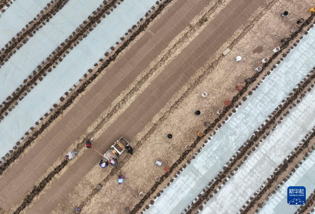 4月18日,唐山市豐南區西葛鎮的農民在田間使用機械設備育秧(無(wú)人機照片)。