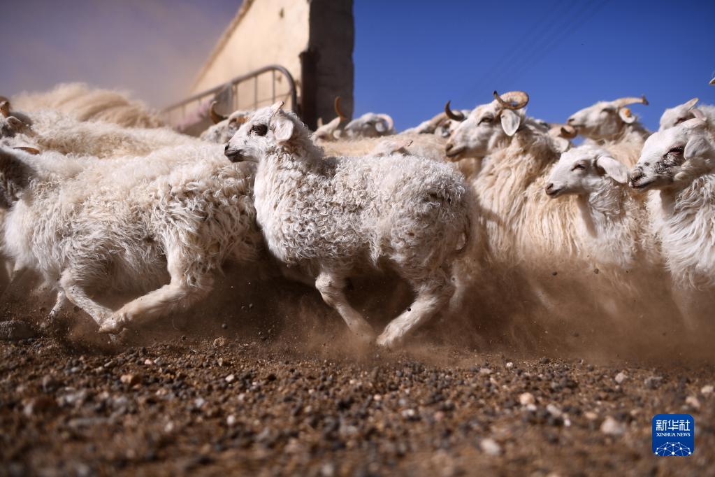 4月14日,在青海省海北藏族自治州剛察縣泉吉鄉寧夏村,牧民拉寶家的羊群離開(kāi)羊圈前往草場(chǎng)。