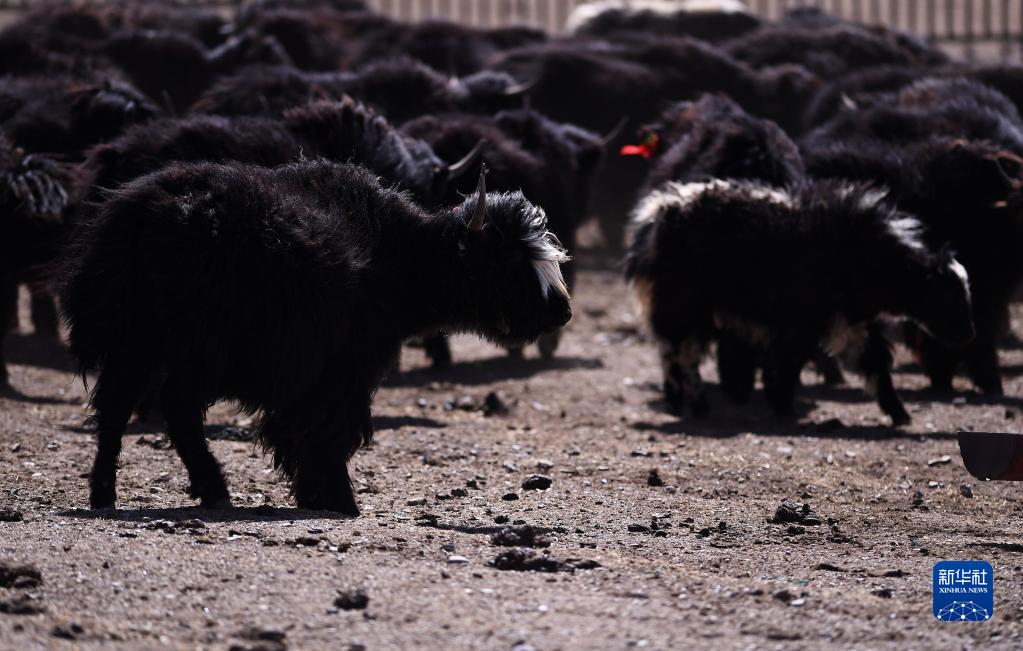4月14日在青海省海北藏族自治州剛察縣環(huán)湖型牦牛良種繁育基地內拍攝的環(huán)湖型長(cháng)毛牦牛。