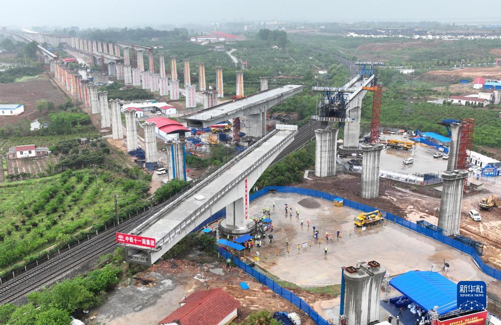 滬渝蓉高速鐵路荊門(mén)特大橋跨焦柳鐵路連續梁轉體前(4月18日攝,無(wú)人機照片)。