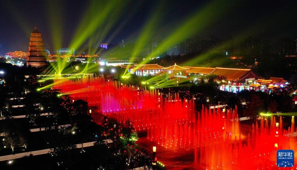 陜西西安大雁塔北廣場(chǎng)音樂(lè )噴泉是西安旅游打卡地之一,每天會(huì )進(jìn)行四場(chǎng)演出,吸引市民和游客前來(lái)觀(guān)看。