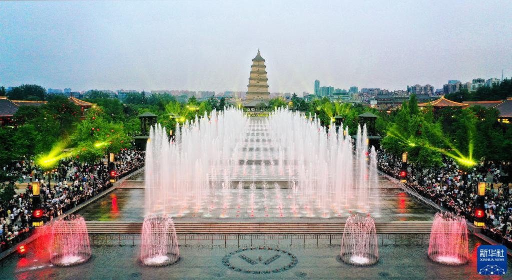陜西西安大雁塔北廣場(chǎng)音樂(lè )噴泉是西安旅游打卡地之一,每天會(huì )進(jìn)行四場(chǎng)演出,吸引市民和游客前來(lái)觀(guān)看。
