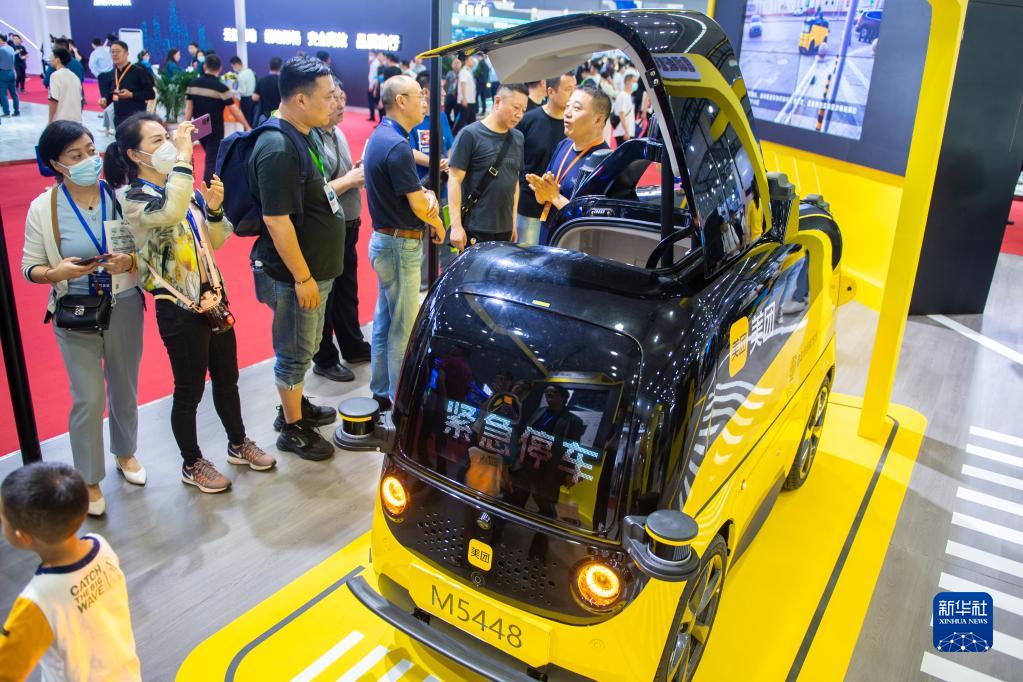 4月19日,在長(cháng)沙國際會(huì )展中心,工作人員(右一)向觀(guān)眾介紹無(wú)人送餐車(chē)。