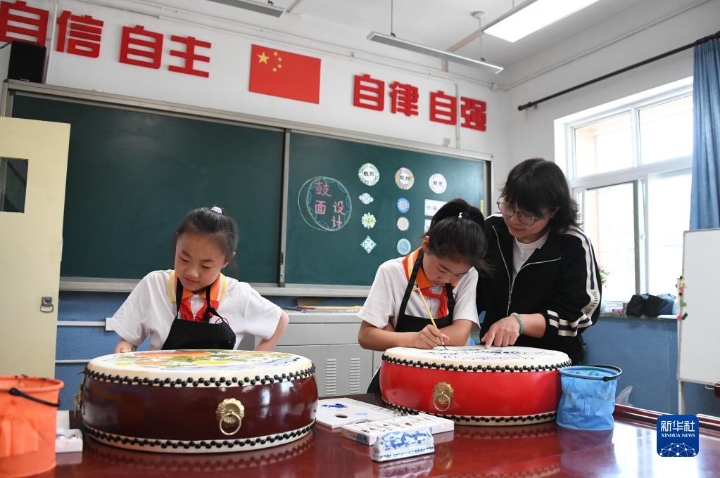 4月19日,在門(mén)樓中心小學(xué),教師在美育課上指導學(xué)生繪制鼓面。