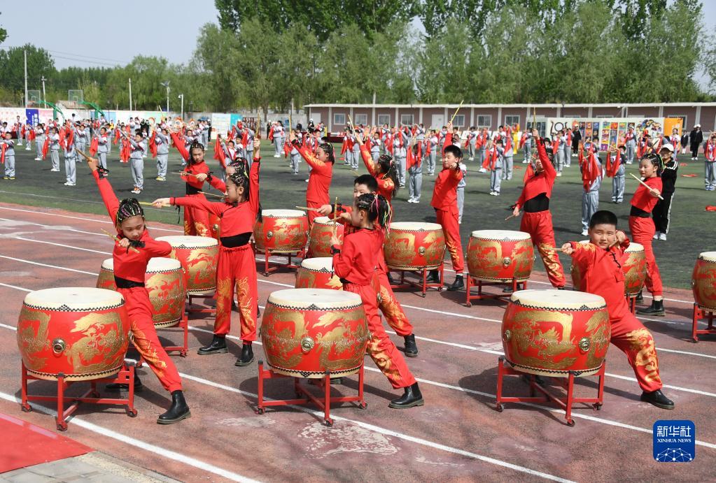 4月19日,門(mén)樓中心小學(xué)的學(xué)生在活動(dòng)中進(jìn)行鼓舞表演。