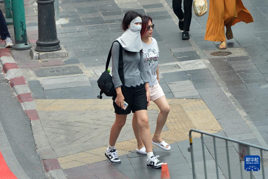 4月19日,行人在泰國曼谷街頭佩戴遮陽(yáng)面罩。