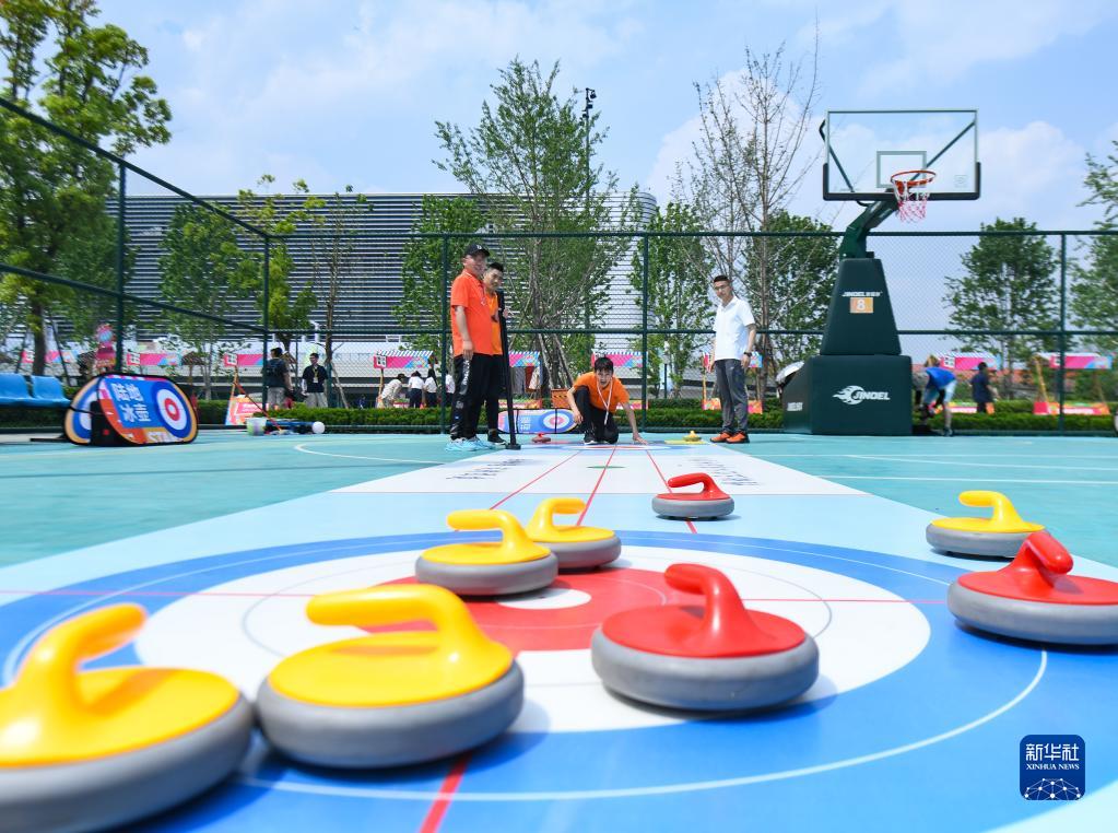 4月19日,在成都東安湖體育公園,體育愛(ài)好者在 “潮流運動(dòng)會(huì )”上體驗陸地冰壺。