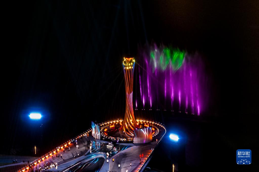 這是4月19日拍攝的第31屆世界大學(xué)生夏季運動(dòng)會(huì )主火炬以及映在水幕上的“100”字樣(無(wú)人機照片)。