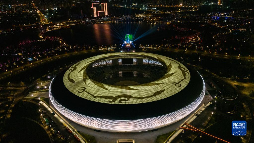 這是4月19日拍攝的第31屆世界大學(xué)生夏季運動(dòng)會(huì )開(kāi)幕式主體育場(chǎng)及主火炬(無(wú)人機照片)。
