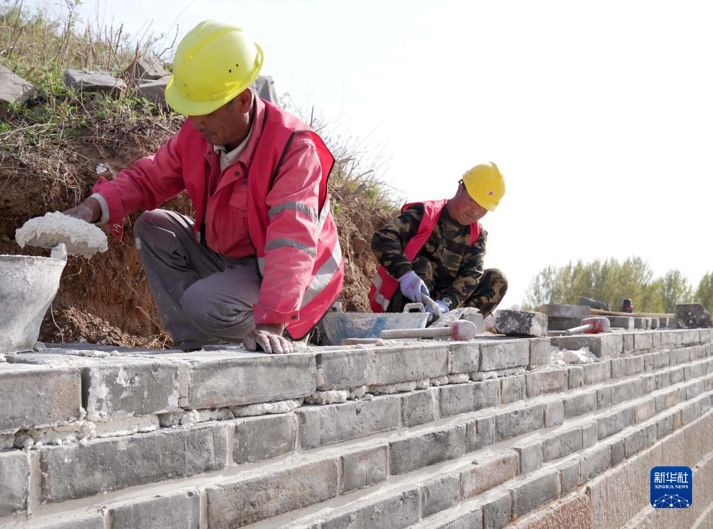 4月19日,工人在山海關(guān)長(cháng)城北翼城修繕工程工地施工。