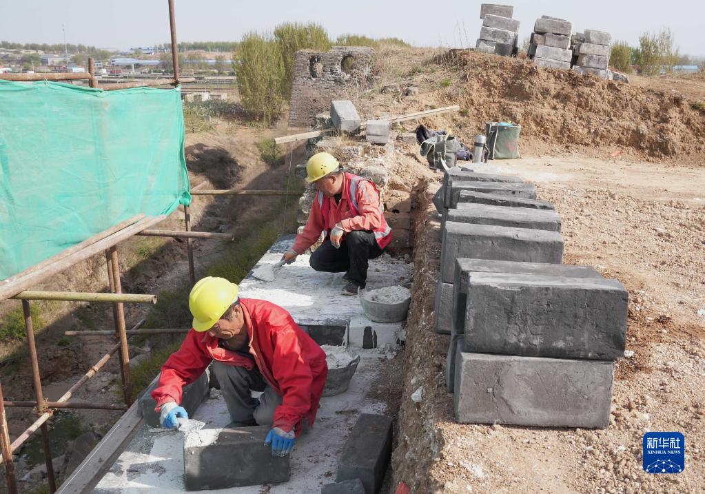 4月19日,工人在山海關(guān)長(cháng)城北翼城修繕工程工地施工。