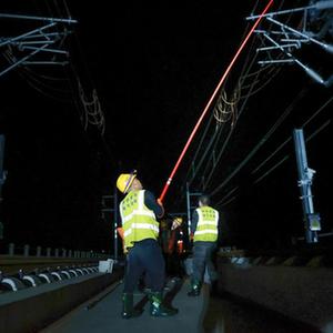 4月20日,中鐵武漢電氣化局工作人員在都勻東站附近的軌道上進(jìn)行驗電操作。