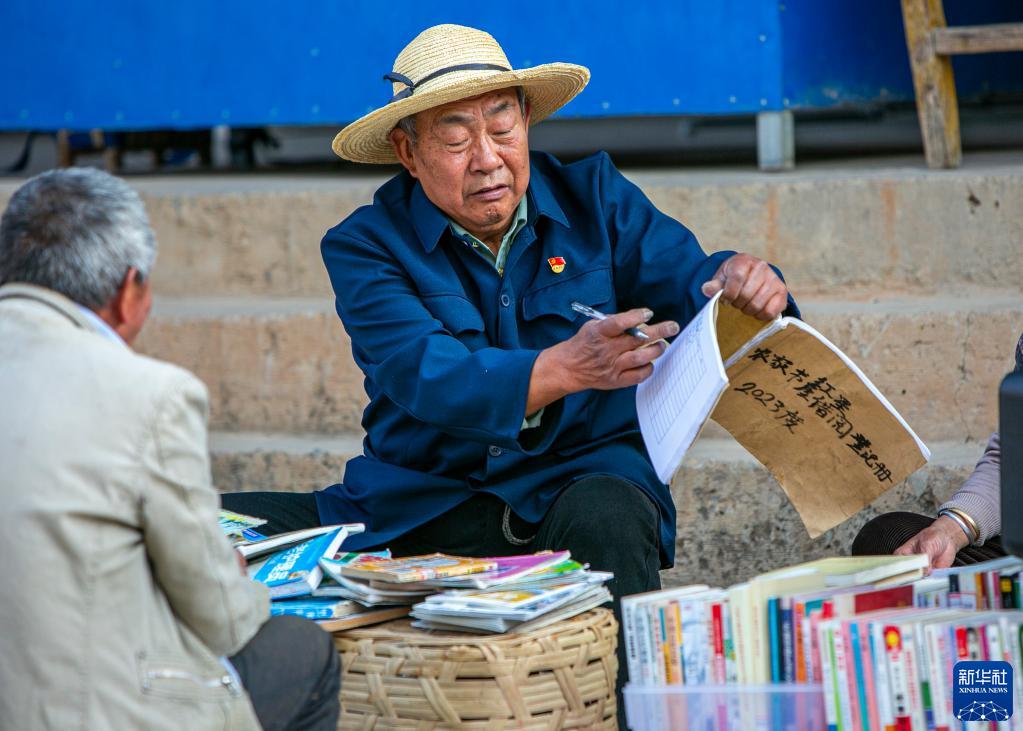 4月19日,李存德在紅星村的愛(ài)心流動(dòng)書(shū)攤查看借閱登記信息。新華社記者 崔文 攝