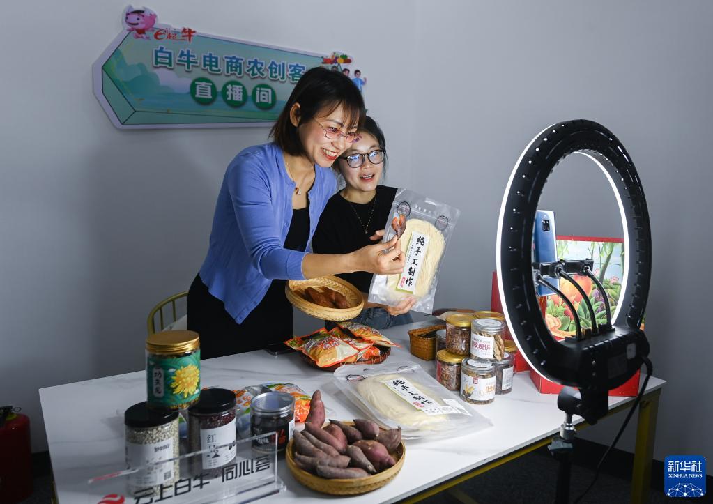 4月20日,在杭州市臨安區昌化鎮白牛村電商大樓的農創(chuàng )客中心直播間,青年創(chuàng )客張青(左)和助手一起推介特色農產(chǎn)品。