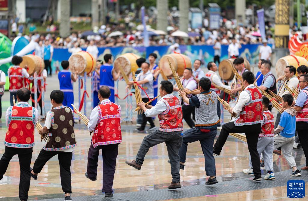 當日,四川省級非遺“興文苗族花山節”展示傳承活動(dòng)在四川省興文縣市民廣場(chǎng)舉行?;顒?dòng)上融入傳統祭祀、農耕文化、民族團結等內容的展演和苗家長(cháng)桌美食宴,讓賓客感受到熱烈的節日氛圍。