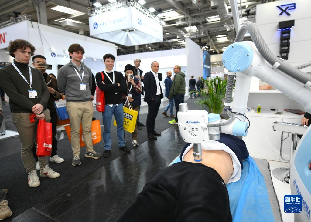 4月18日,在德國漢諾威工博會(huì )上,遨博協(xié)作機器人為一名男子理療。