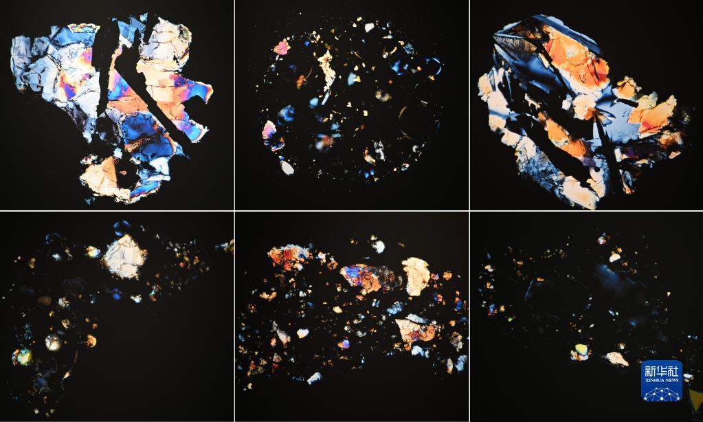 這是一張拼版圖片,圖中照片為4月19日拍攝的展出中的不同月壤顆粒正交偏光顯微照片。