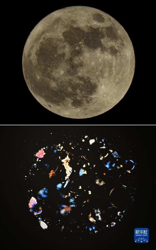 這是一張拼版照片,上圖為2022年6月14日拍攝的“超級月亮”(新華社發(fā) 胡攀學(xué)攝);下圖為2023年4月19日拍攝的展出中的月壤顆粒正交偏光顯微照片。