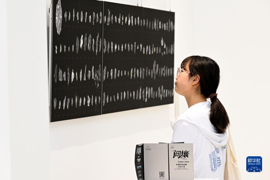 4月19日,觀(guān)眾在展覽上觀(guān)看月壤顆粒景深合成顯微照片。