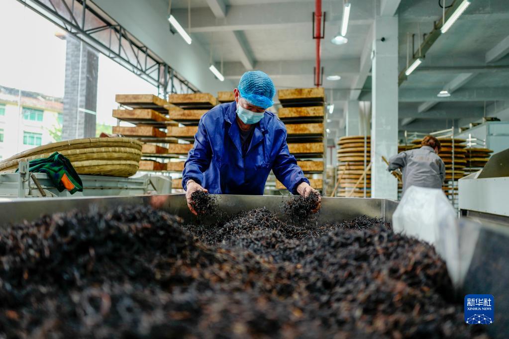 4月18日,重慶市南川區德隆鎮千年金山紅古樹(shù)茶的生產(chǎn)車(chē)間內,一名工人在檢查發(fā)酵烘焙后的茶葉。